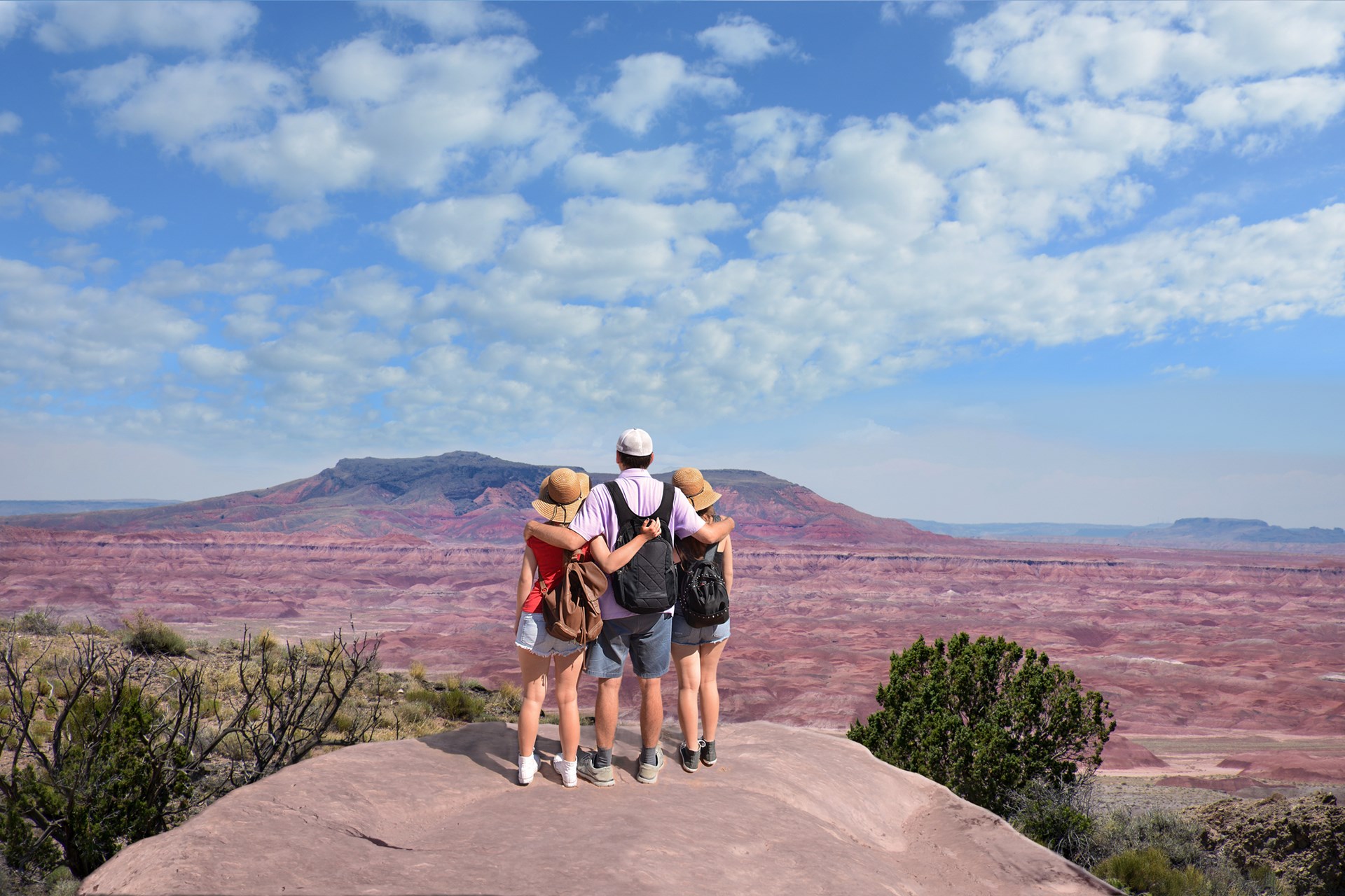 Finish up at Petrified Forest National Park. Route 66 cuts through colorful badlands and fossilized forests. Hike the Painted Desert Rim Trail, explore The Teepees and Blue Mesa, and follow the Giant Logs Trail at the Rainbow Forest Museum to see massive logs. It’s a hands-on history and geology lesson for the whole family!