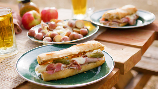 4. Score the top of the brie and brush with remaining balsamic. Place in the center of the skillet, remove toasted bread and close grill.