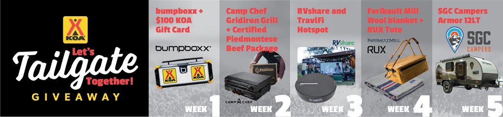 Starting October 8, KOA and our partners are giving campers the chance to win weekly prizes over 5 weeks designed to upgrade your tailgating game. Prizes include: