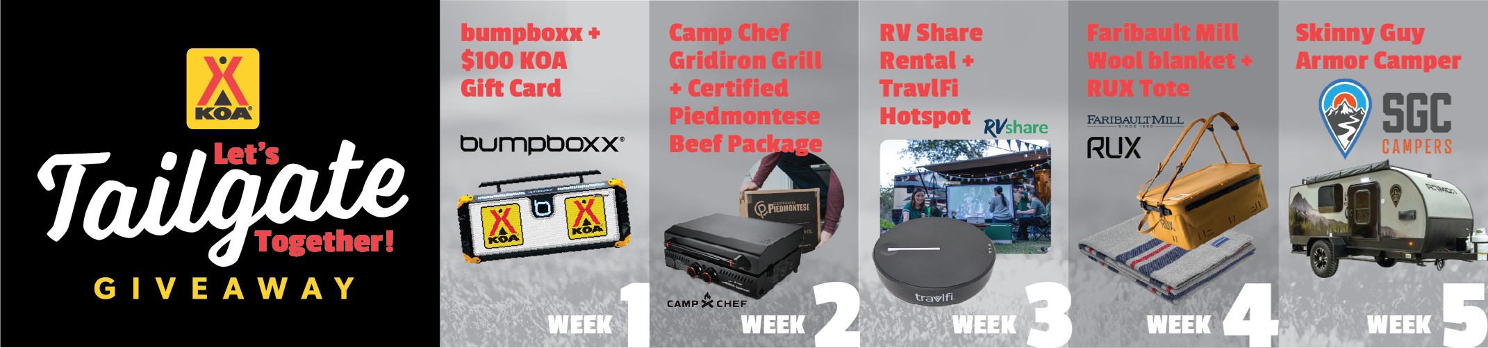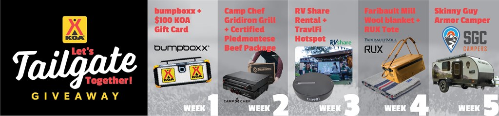 Starting October 8, KOA and our partners are giving campers the chance to win weekly prizes over 5 weeks designed to upgrade your tailgating game. Prizes include:
