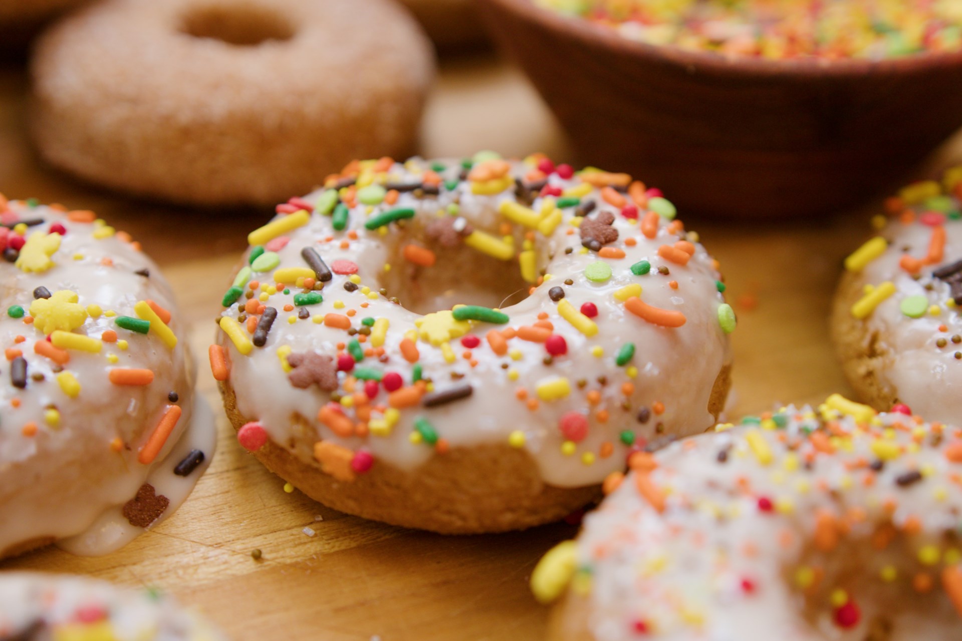 1. Combine powdered sugar and cider to create a thick glaze. Dip each donut in glaze and top with sprinkles.