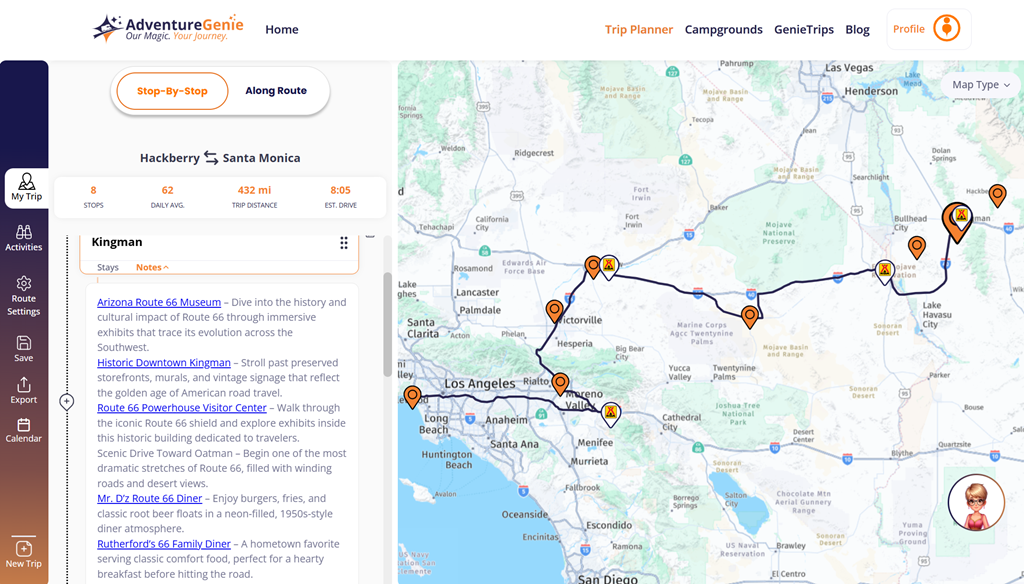 This last—or first, depending on your direction—section of Route 66 is just as special as all the others, so take your time getting to the coast. Not only do you not want to miss some of the best souvenir shops and the “coolest visitor center in Arizona,” but you’ll be glad you slowed down when you hit Oatman, a tiny town where wild burros outnumber residents (and don’t necessarily follow traffic rules). Turn this Route 66 itinerary into a full interactive trip with AdventureGenie – customize your route, stops and pace in minutes.