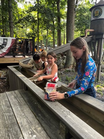 Kids enjoying gemstone mining at water sluice in Gettysburg KOA