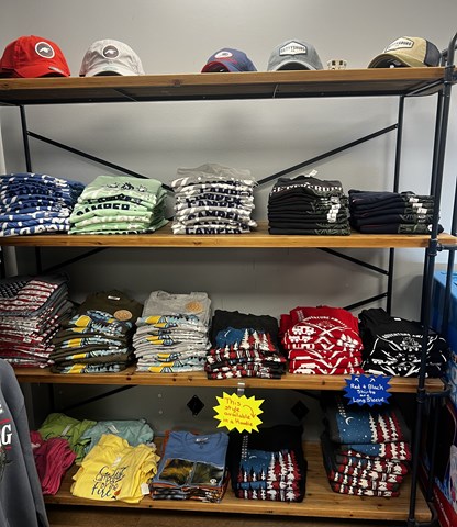 Display of Gettysburg-themed T-shirts and souvenirs at Gettysburg KOA campstore