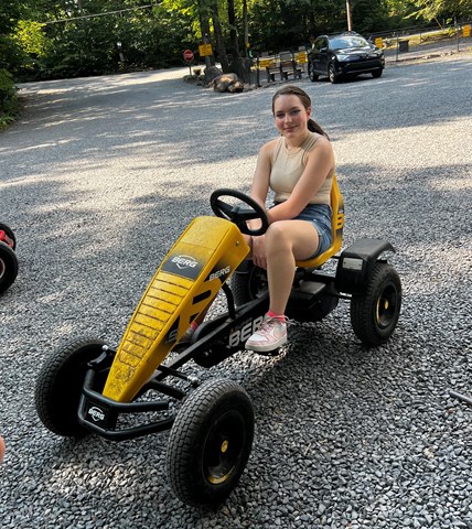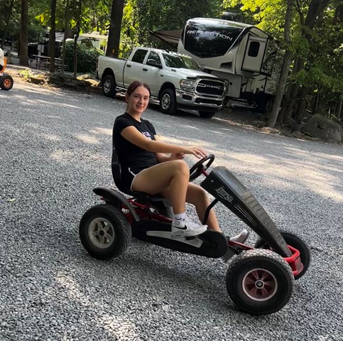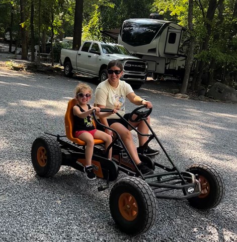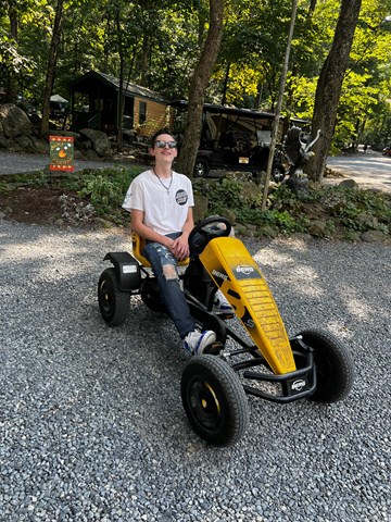 Happy camper riding a go-kart at Gettysburg KOA, experiencing fun outdoor camping activities.
