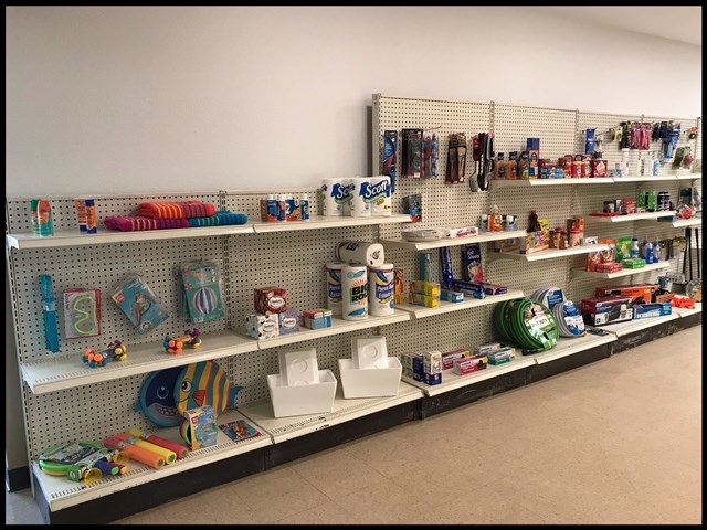 Store - Our store has: canned goods, RV supplies, personal hygiene products, cooking utensils, cleaning products, paper goods, seasonal pool items, ice, soda, water, and juice.
