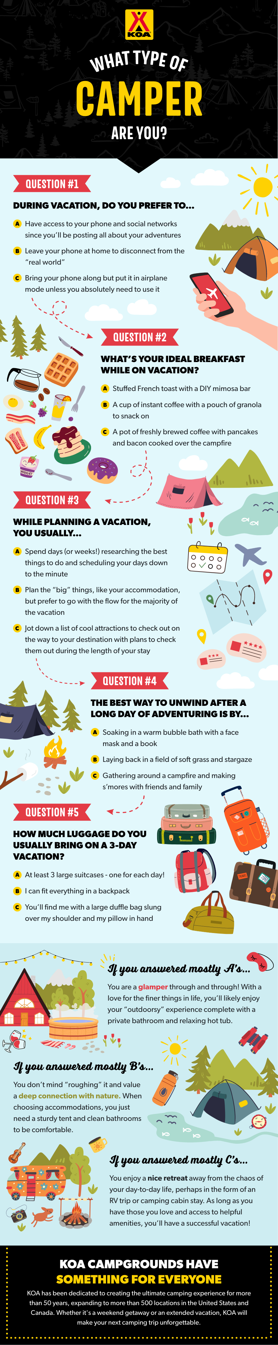 - Glamping: Glamping is a special type of camping that has grown in popularity. In the 2019 KOA North American Camping Report, 45% of surveyed campers said they want to try glamping sometime in the future. What makes glamping so appealing for beginners is how easy and unique it is. Instead of assembling your own campsite, Glamping Tents are already set up, with comfortable furnishings and decorations inside. You can also go glamping in other unique lodging options, like renovated cabooses, yurts and tree houses. Contact a KOA to learn more about available glamping options.